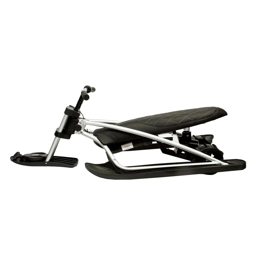 Визуального модный электроснегокат выглядит компактно и эргономично. Общий вес техники сравнительно легкий, составляет 12,7 кг. Конструкция рамы – долговечная и надежная, стальная, не деформируется при эксплуатации в жестких условиях. Большое удобное сиденье покрыто экокожей. Мягкое, повторяет анатомические части тела ездока. Лыжи изготовлены из ударопрочного пластика, гарантируют отличный накат.