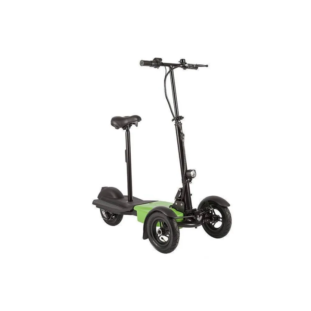 Электросамокат Eltreco Scuddy Light отличается оригинальной конструкцией, ведь производитель оснастил его тремя колёсами - двумя передними и одним задним. За счёт этого самокат более устойчив во время движения и совершения различных манёвров. Надувные 10-дюймовые колеса с глубоким протектором обеспечивают отличное сцепление и компенсируют неровности дорожного покрытия. Это дает возможность передвигаться не только по гладкому асфальту, но и по грунтовым дорогам и даже лесным тропинкам. Габариты самоката позволяют ездить по тротуарам, минуя утомительные автомобильные пробки. Специальный звуковой сигнал предупредит пешеходов о приближающемся транспорте. Данная модель уверенно разгоняется до 25 км\час и способна преодолеть до 25 километров пути на одном заряде батареи. Во время длительной поездки райдер может воспользоваться удобным сиденьем. В темное время суток на помощь придет яркая светодиодная фара. На ряду с задними стоп-сигналами она обеспечивает безопасность движения, делая самокат заметным для других участников дорожного движения. Управление на данной модели настолько интуитивно понятное, что с ним справится даже ребенок. Электросамокат Eltreco Scuddy Light имеет складную конструкцию, благодаря чему его можно легко перевозить в автомобиле или общественном транспорте.