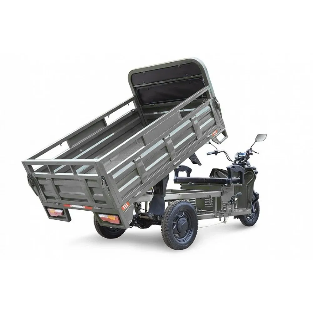 Элетротрицикл рассчитан на водителя с пассажиром, оснащен мягким сиденьем, повторяющим анатомические части тела, снимающую усталость при длительной дороге. Вместительный кузов представлен размерами 1800 x 1250 x 475 мм (Д х Ш х В), имеет откидные борты, что удобно для сельских жителей, транспортирующих сено с полей.